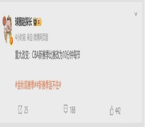 根据球圈赵探长的消息,CBA新赛季将会有一大改变:比赛改为10分钟每节。