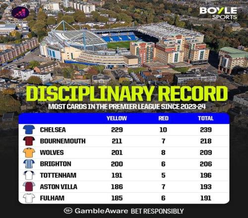 自2324赛季以来英超红黄牌榜:切尔西共计239张居首