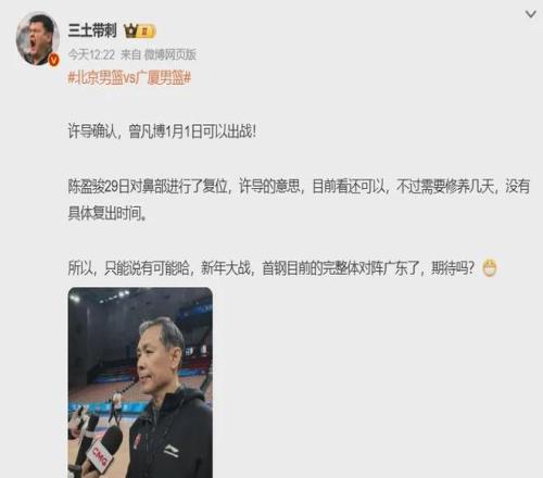 几乎与此同时,北京队主帅许利民确认曾凡博会出战北京时间2026年1月1日北京队主场VS广东队的新年大战,这是他的本赛季首秀。