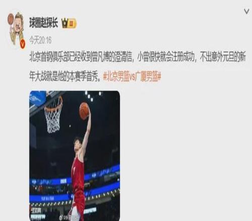 国内知名媒体人报道:北京队已经收到曾凡博的澄清信,即将注册完毕。