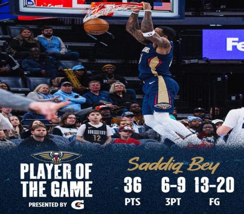 萨迪克-贝这36分是鹈鹕生涯新高,6个三分球也是鹈鹕生涯新高,末节19分也是鹈鹕生涯新高。