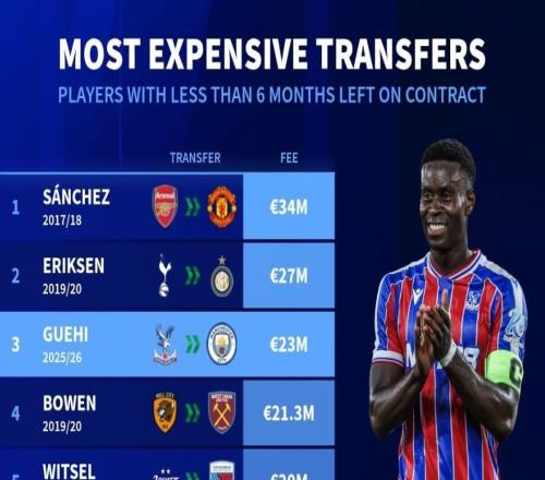 德转列合同剩半年球员转会身价榜:桑切斯3400万第1,格伊第3